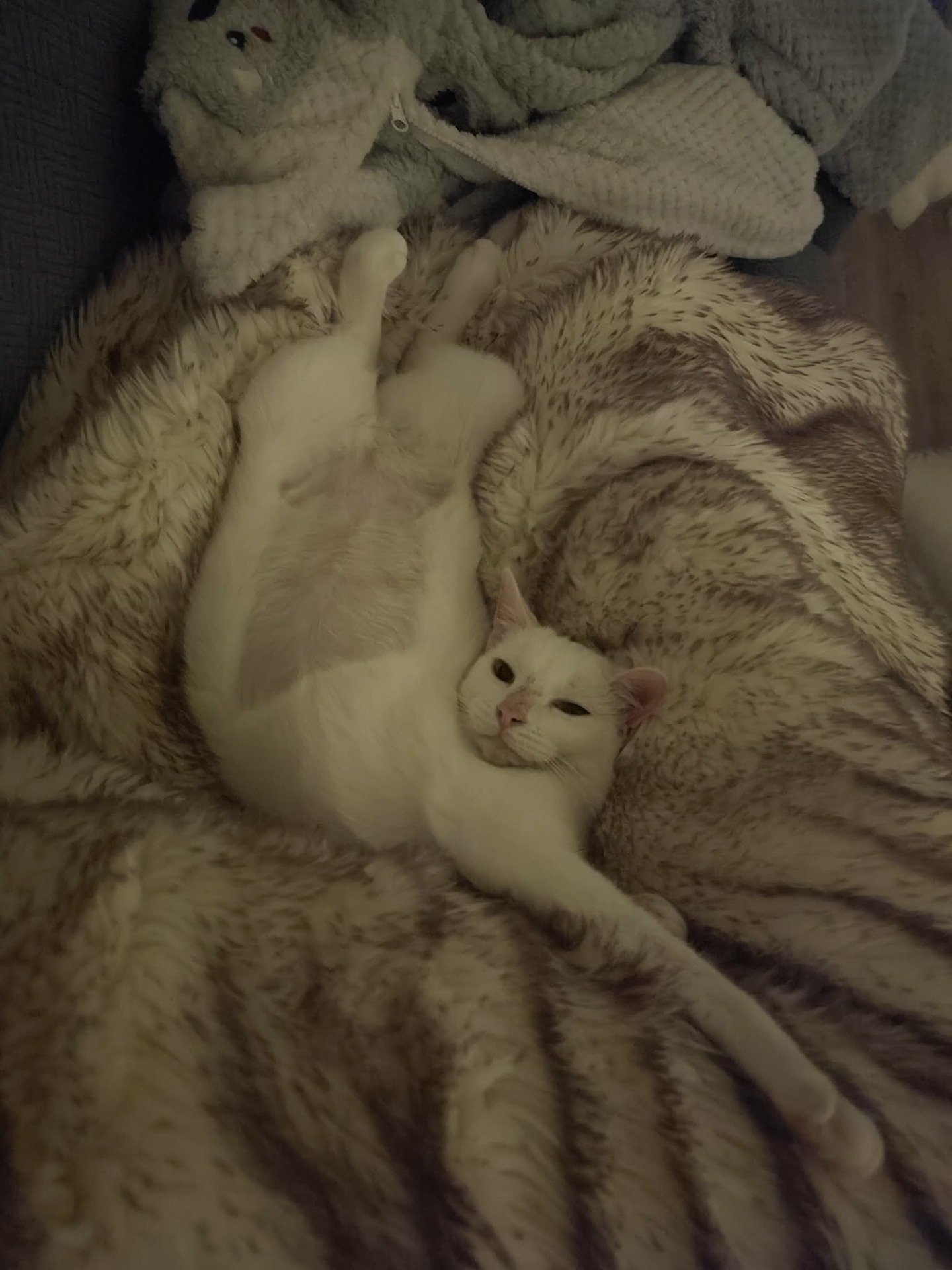 Encore en douceur dans sa socialisation, elle fait de très beaux progrès : elle se laisse désormais caresser, vient dormir contre son humain, et apprécie la présence calme et rassurante de l'homme.